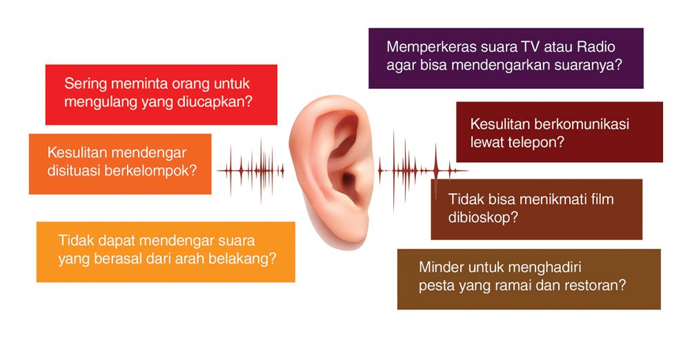 Gangguan pendengaran dapat terjadi tiba-tiba, tetapi seringkali terjadi bertahap dan tidak disadari pada awalnya. Beberapa tanda dan gejala awal gangguan pendengaran seperti disebutkan pada gambar disamping.